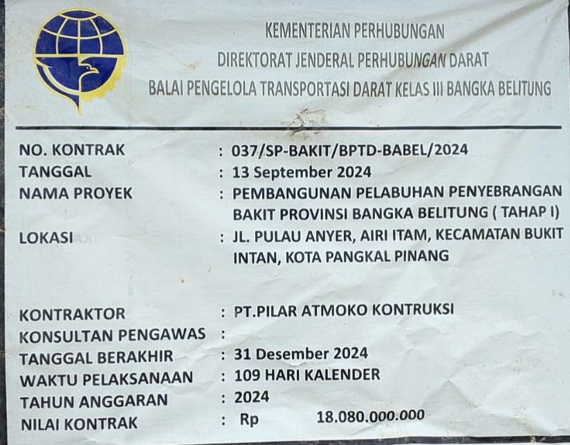 Wartapolri | Bangka Barat – Aroma dugaan penyimpangan pada proyek pembangunan dermaga di Desa Bakik, milik BPTD kelas III Bangka Belitung semakin menyengat.