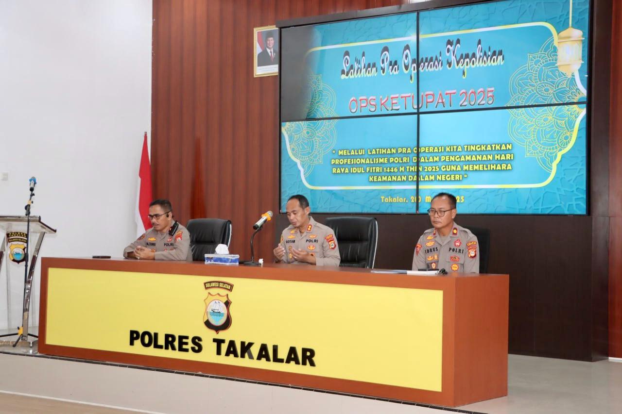 Takalar, 20 Maret 2025 – Polres Takalar menggelar kegiatan Latihan Pra Operasi (Lat Pra Ops) dengan sandi Ketupat – 2025 di Aula Wicaksana Laghawa pada Kamis (20/3) pukul 10.00 WITA. Kegiatan ini mengusung tema “Melalui Latihan Pra Operasi, Kita Tingkatkan Profesionalisme Polri dalam Pengamanan Hari Raya Idul Fitri 1446 H Tahun 2025 Guna Memelihara Keamanan dalam Negeri.”