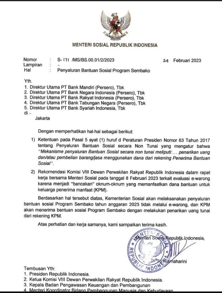 Akan tetapi ,di tahun 2023 bulan februari Itu ada surat dari kementrian sosial tertanggal 24 Februari yang isinya tidak memakai e.warung, masyarakat bebas mengambil uang di mana saja yang penyalurannya lewat ATM,dan bebas belanja di mana saja .