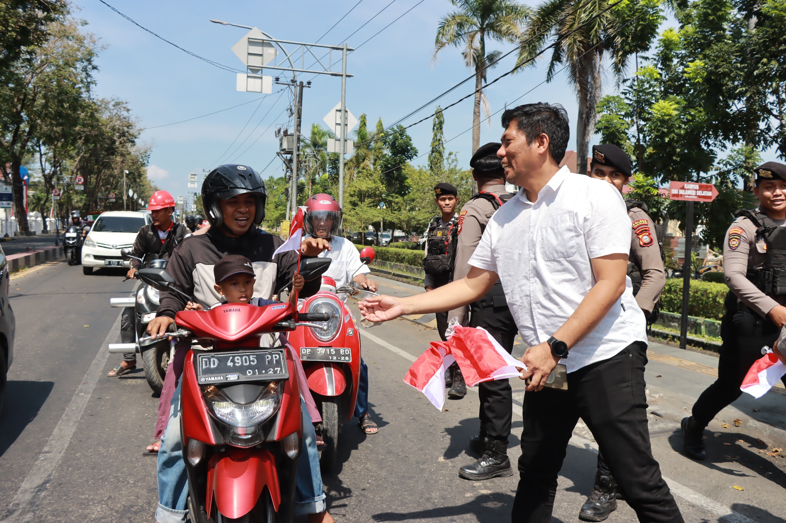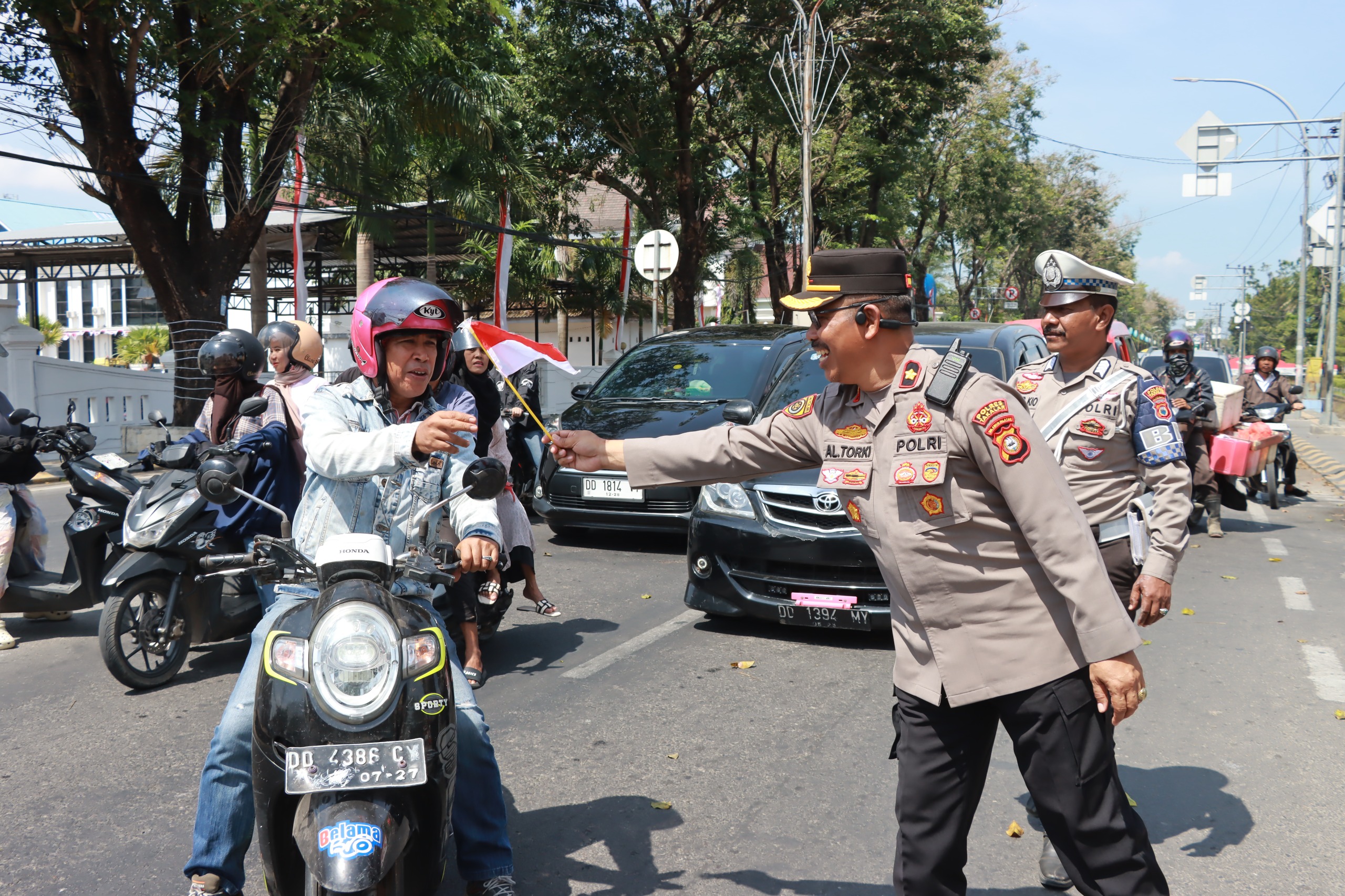 Takalar, 6 Agustus 2025 – Dalam rangka menyambut Hari Ulang Tahun (HUT) Kemerdekaan Republik Indonesia ke-80, Polres Takalar yang dipimpin langsung oleh Wakapolres Takalar, Kompol Alauddin Torki, S.Sos., M.Si, didampingi Kasat Intelkam AKP Asrullah, S.H., M.H, melaksanakan kegiatan pembagian bendera Merah Putih mini kepada para pengguna jalan di poros Kabupaten Takalar, Sulawesi Selatan, Rabu (06/08).