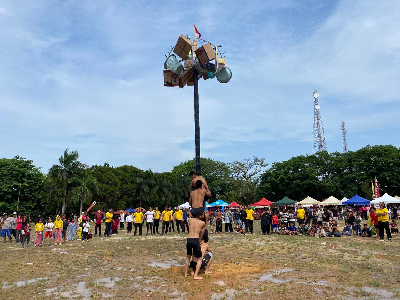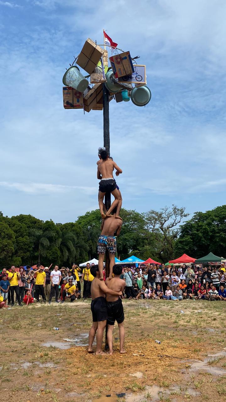Puluhan peserta yang terdiri dari warga lokal dengan penuh semangat dan tawa mengikuti lomba panjat pinang. Sorak sorai penonton dan canda tawa menjadi gambaran suasana hangat di tengah perlombaan yang menuntut kerja sama, strategi, dan kekompakan.