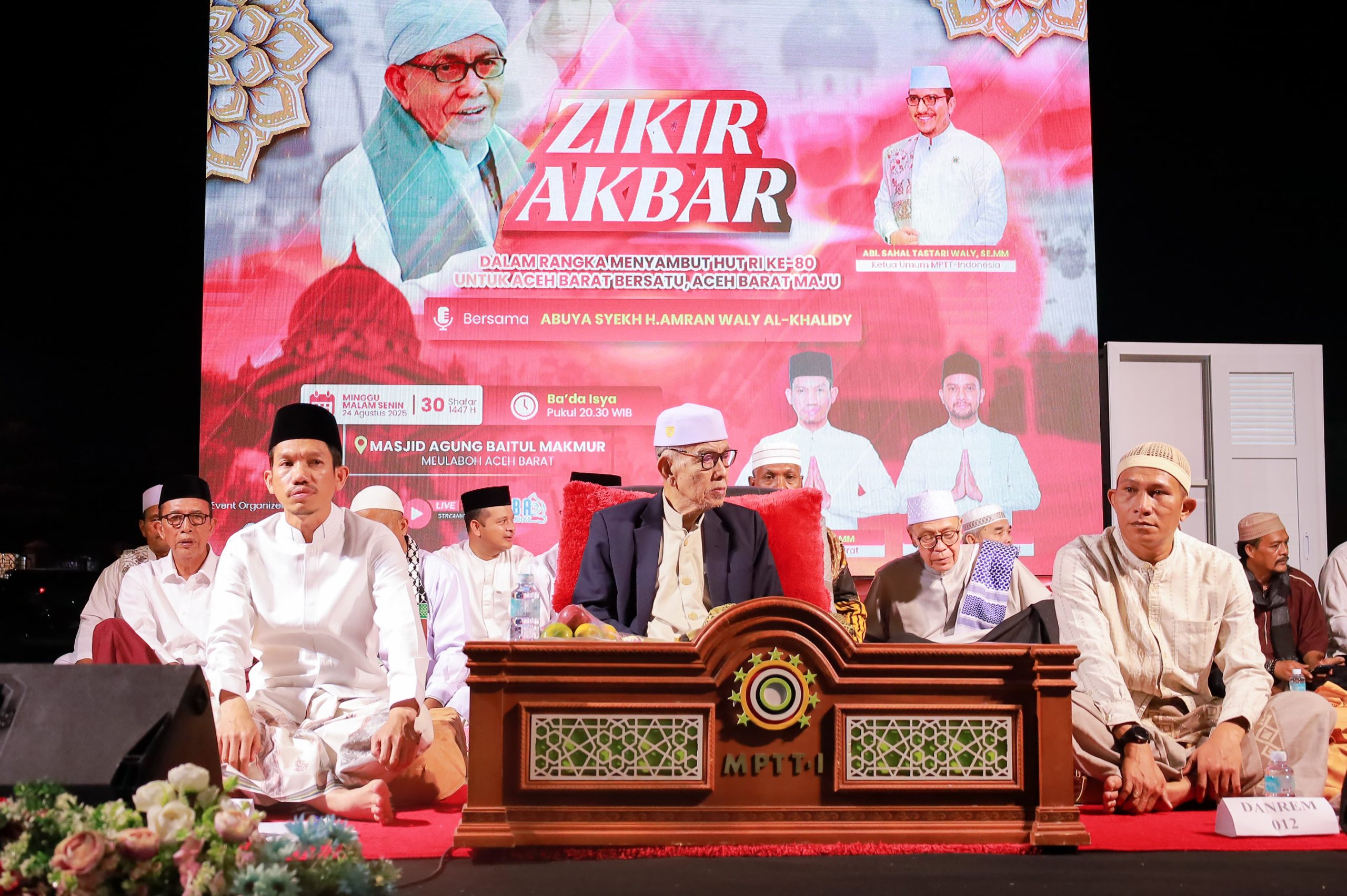 Zikir Akbar dalam rangka memperingati HUT RI ke 80 tersebut dipimpin langsung oleh Wali Agama Aceh sekaligus Pengasuh Majelis Pengajian Tauhid Tashawuf Indonesia (MPTT-I) Abuya Syeikh Haji Amran Waly Al-Khalidy.