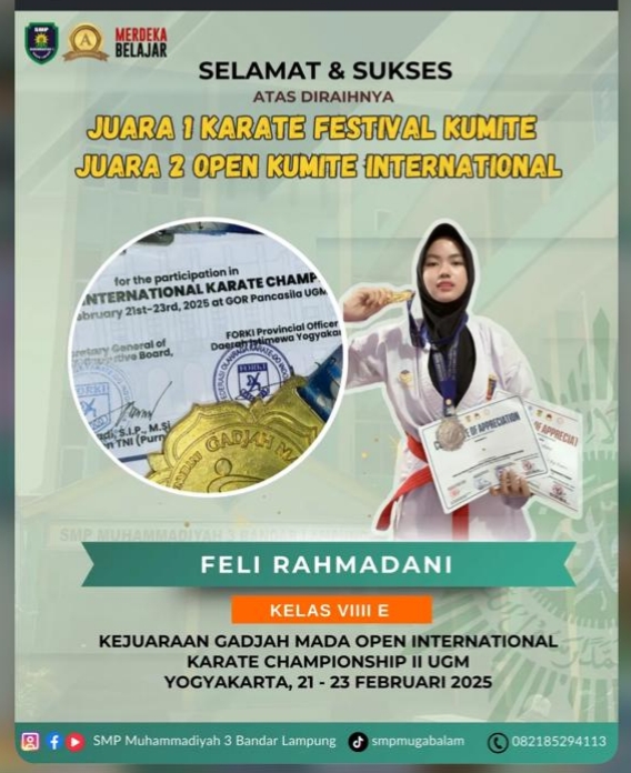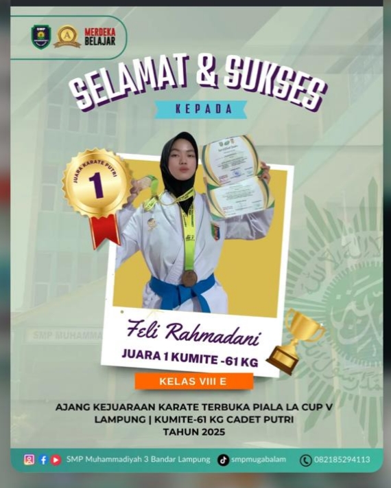 Warta Polri | Bandar Lampung – Siswi SMP Muhammadiyah Bandar Lampung, Feli Ramadhani kembali mencatatkan prestasi gemilang di dunia karate. Berdasarkan informasi yang dihimpun diketahui Feli yang merupakan buah hati dari pasangan ayah Romli dan Ibu Sukarni baru-baru ini menyumbang medali dalam Kejuaraan Gajah Mada Open International Karate Championship 2025 yang digelar di Yogyakarta.