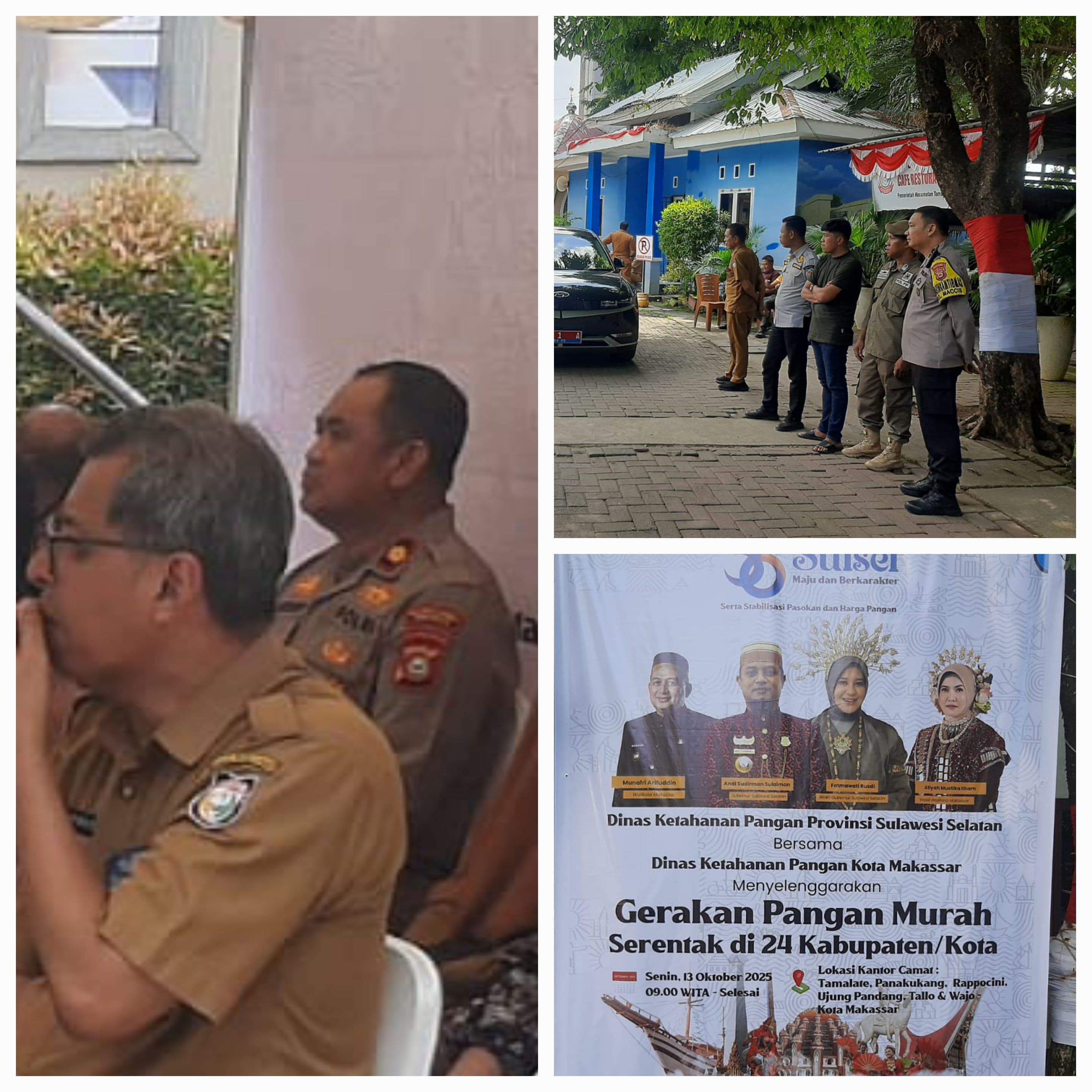 MAKASSAR – Kapolsek Tamalate, Kompol Syarifuddin.,S.Sos.,M.H. menghadiri kick off launching Gerakan Pangan Murah (GPM) serentak di 24 Kabupaten/kota untuk masyarakat yang digelar di kantor Camat Tamalate, kelurahan Maccini Sombala, Jl. Danau Tanjung bunga Makassar, yang di selenggarakan pada senin (13/10/2025). Kegiatan tersebut digelar oleh Dinas ketahanan Pangan Provinsi Sulsel bersama Dinas ketahanan Pangan kota Makassar, dalam rangka hari jadi Sulsel ke-356. untuk stabilisasi pasokan pangan dan harga pangan di Makassar.