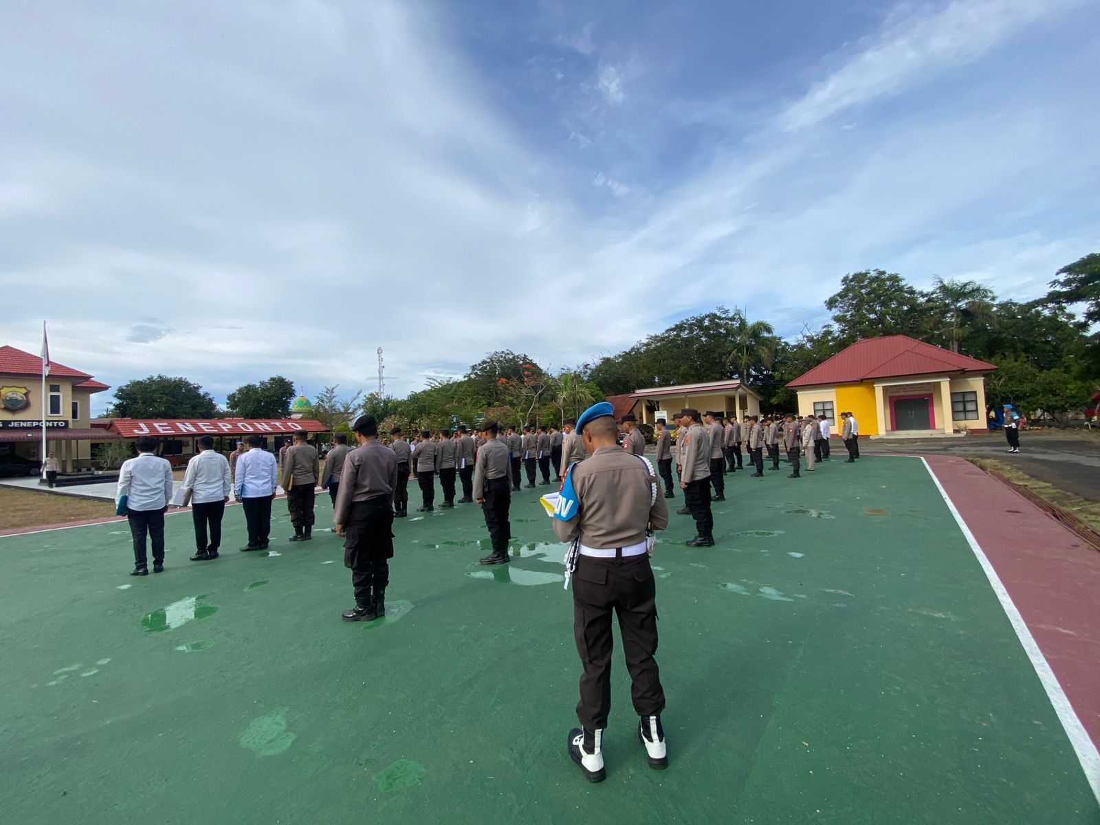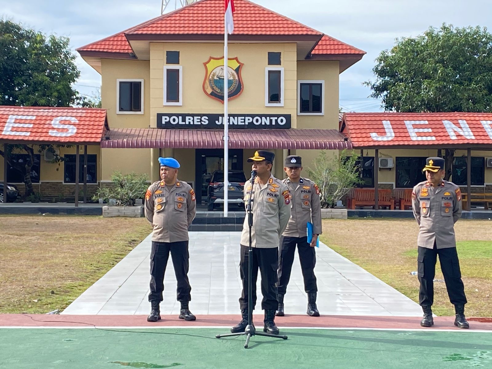 Apel yang berlangsung di lapangan apel Mapolres Jeneponto ini sekaligus menjadi forum komunikasi pimpinan (jam pimpinan). Kegiatan ini dihadiri secara lengkap oleh seluruh jajaran, termasuk Wakil Kapolres Jeneponto (Waka Polres) Kompol Sahabuddin, SE, M.Ap., Pejabat Utama (PJU), para Kapolsek beserta Kanit Polsek jajaran, serta seluruh personel Perwira, Bintara, dan ASN.