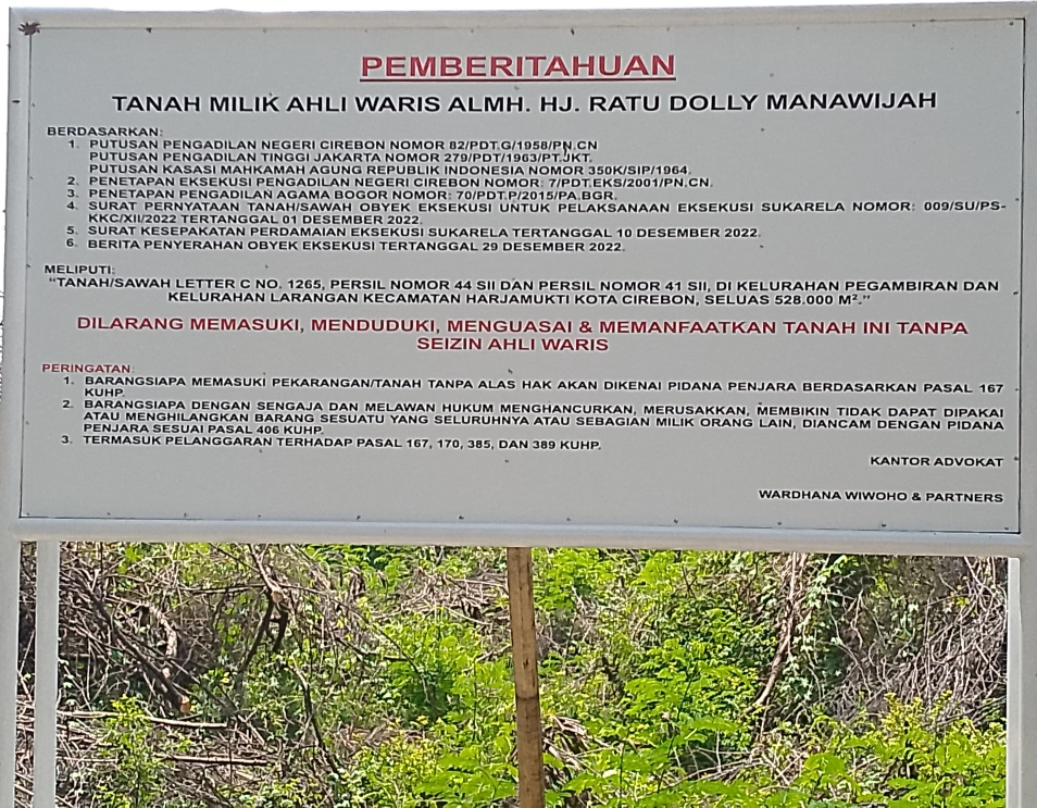 Namun, kuasa hukum sebelumnya dari ahliwaris diduga telah melakukan penjualan beberapa objek tanah tersebut dengan landasan hukum yang tidak sah, sehingga kini terjadi gugatan di Pengadilan Negeri Sumber terkait transaksi yang belum selesai.