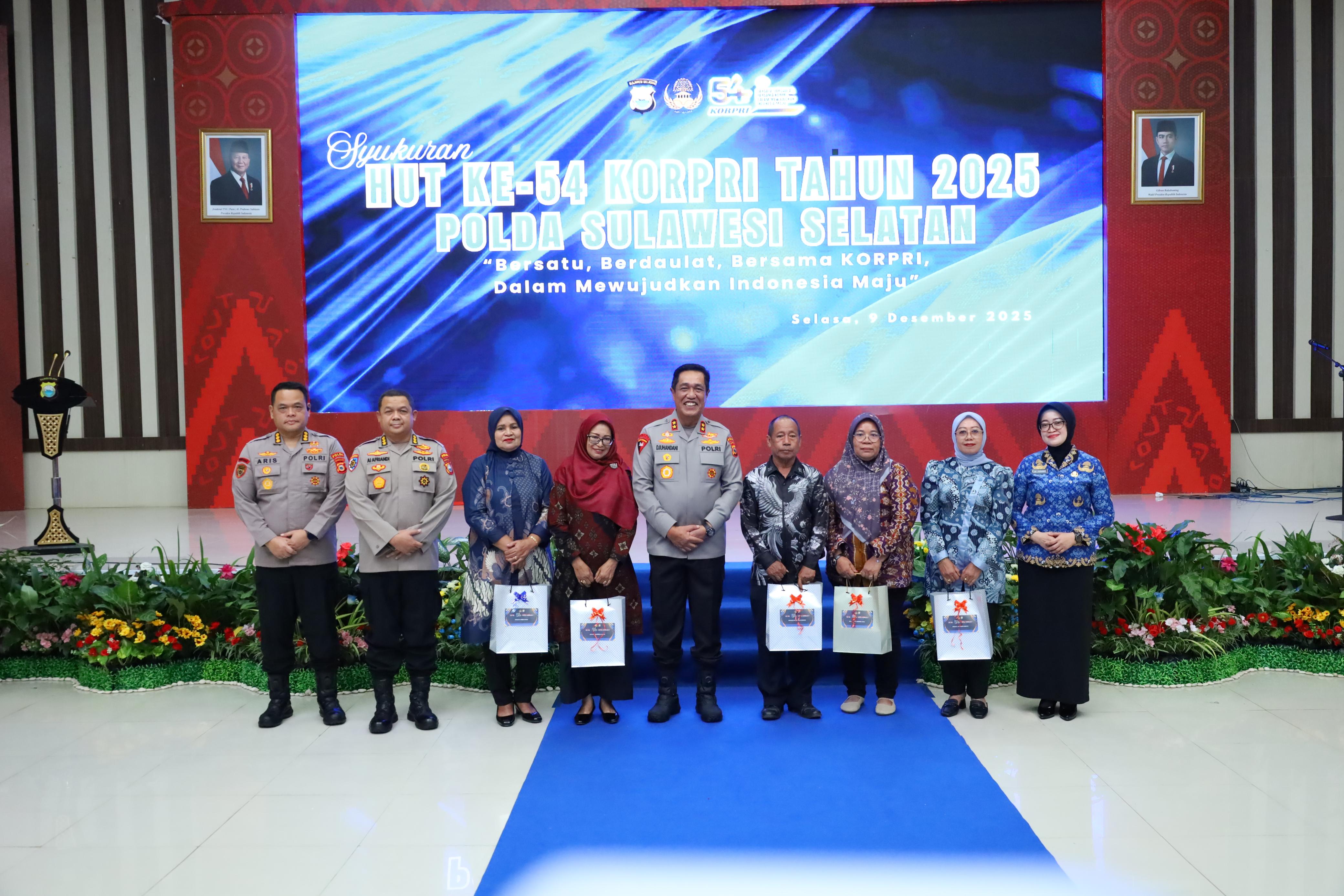 Kepolisian Daerah Sulawesi Selatan menggelar acara Syukuran dalam rangka Hari Ulang Tahun (HUT) Ke-54 Korps Pegawai Republik Indonesia (Korpri) Tahun 2025 di Aula Mappaoddang Mapolda Sulsel, Selasa (09/12/2025). Kegiatan tersebut dihadiri langsung oleh Kapolda Sulawesi Selatan Irjen Pol. Djuhandhani Rahardjo Puro, S.H., M.H.