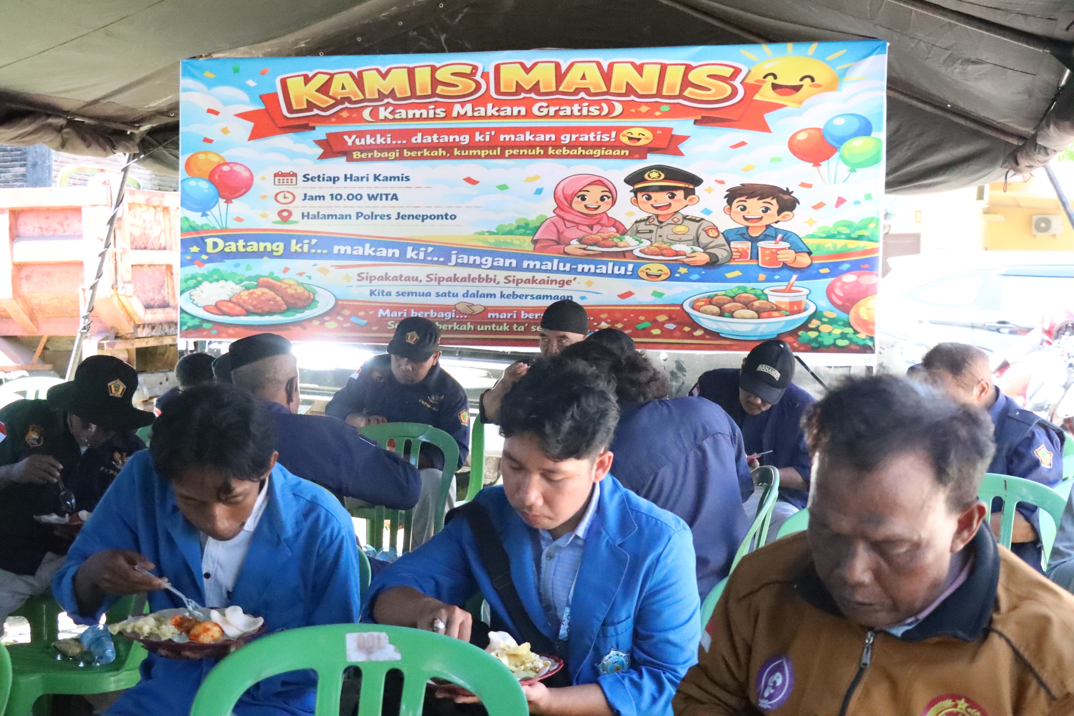 Polres Jeneponto menggelar kegiatan rutin “Kamis Manis”, sebuah program makan siang gratis yang terbuka untuk seluruh lapisan masyarakat, termasuk personel Polri sendiri.